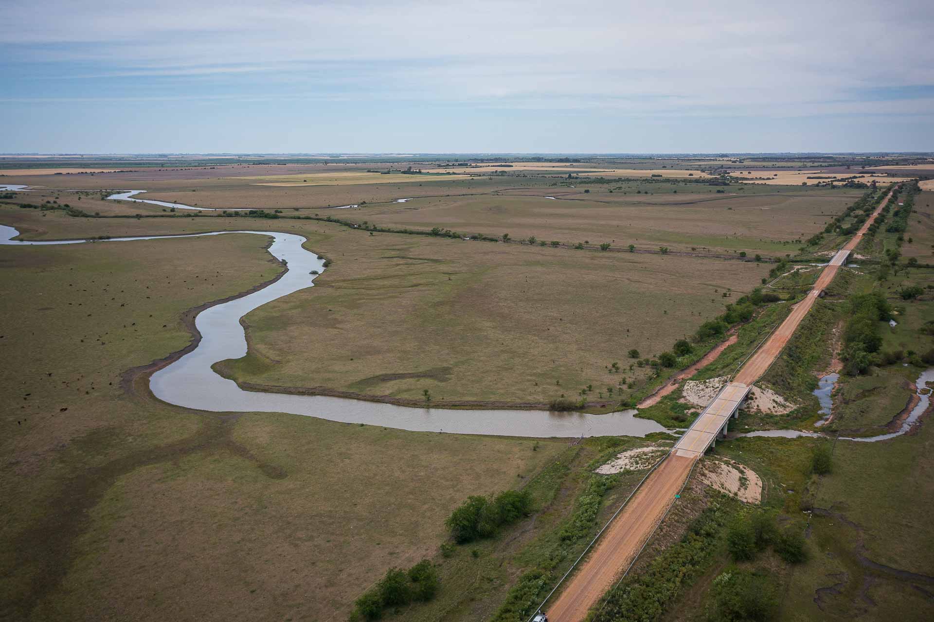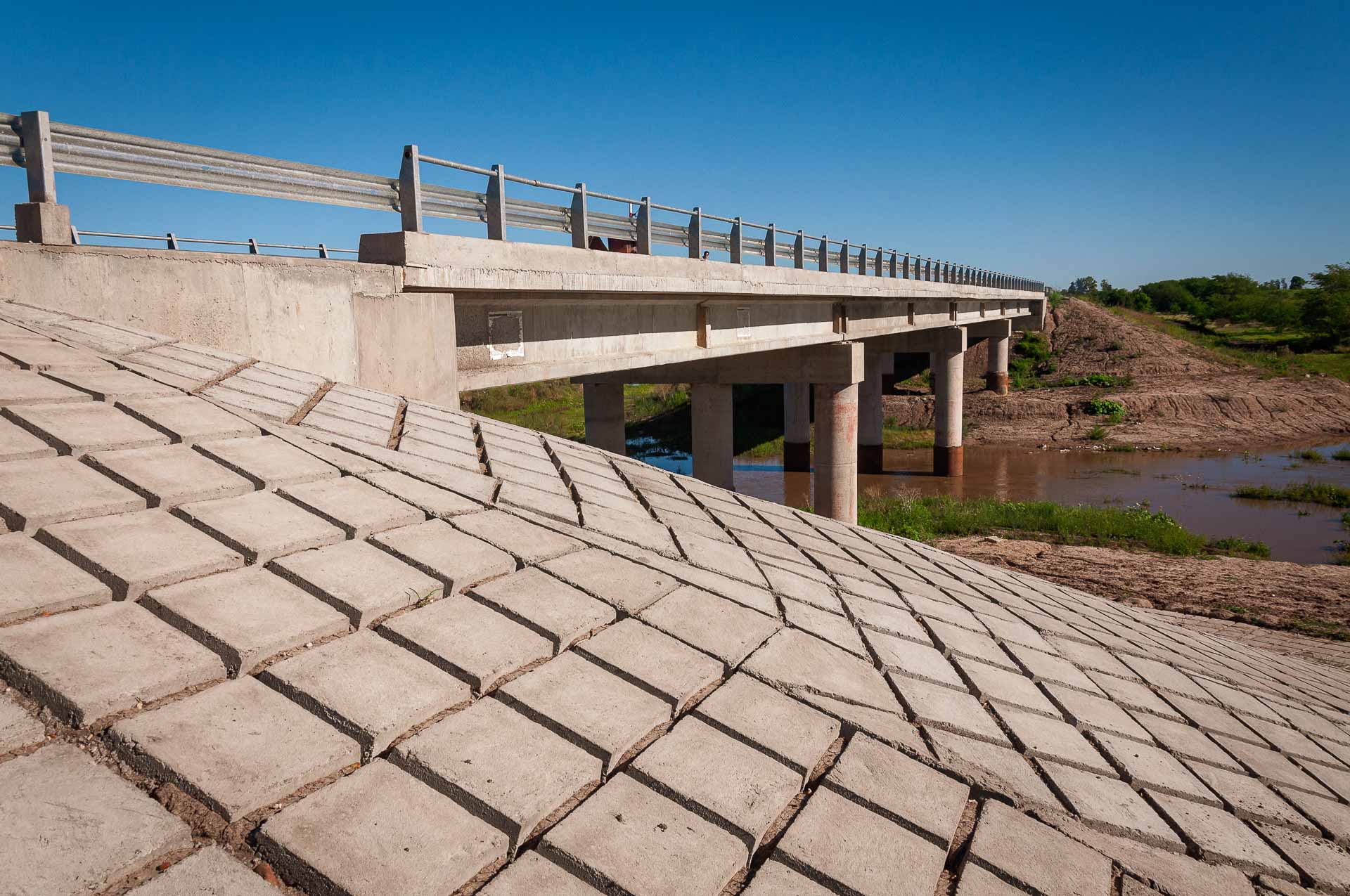 Superestructura de vigas metálicas IPN 550 (arenado y pintado), y ejecución de prelosas de Hº de 7cm y losas tableros de Hº esp. 18cm. Protección hidráulica flexible en estribos y pilas intermedias. Ejecución de alcantarillas para cunetas (acceso a propiedades) y transversales. Mejoramiento de camino de ripio existente entre RN Nº 12 y El Pueblito (4,5km).