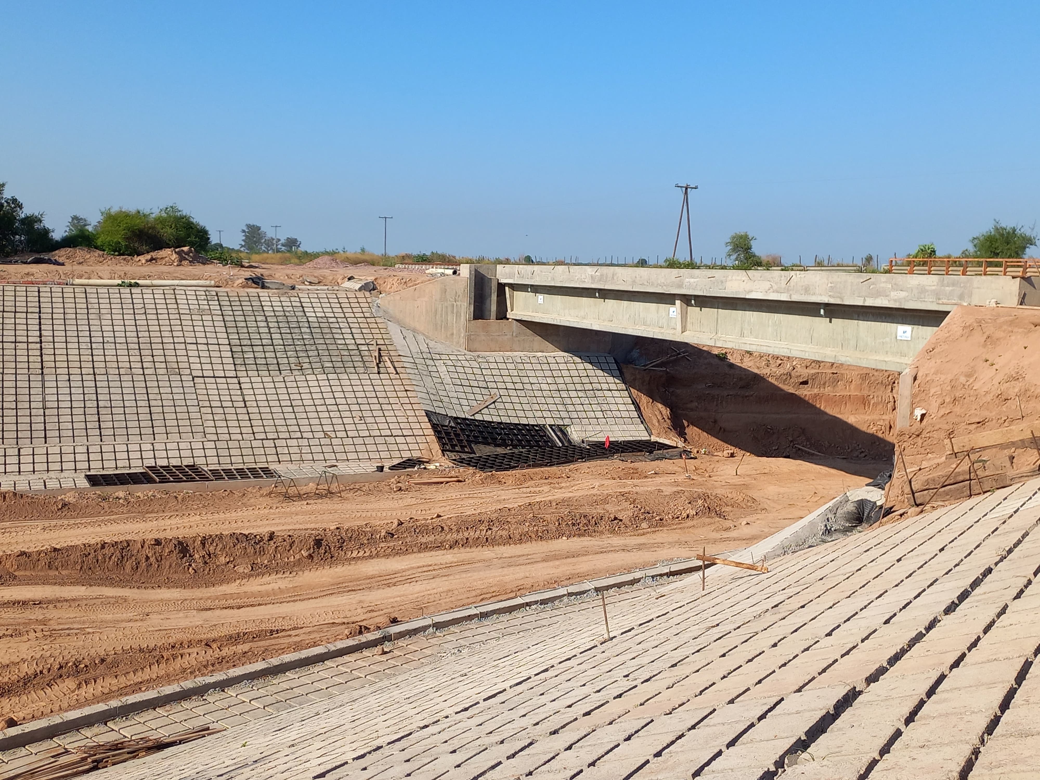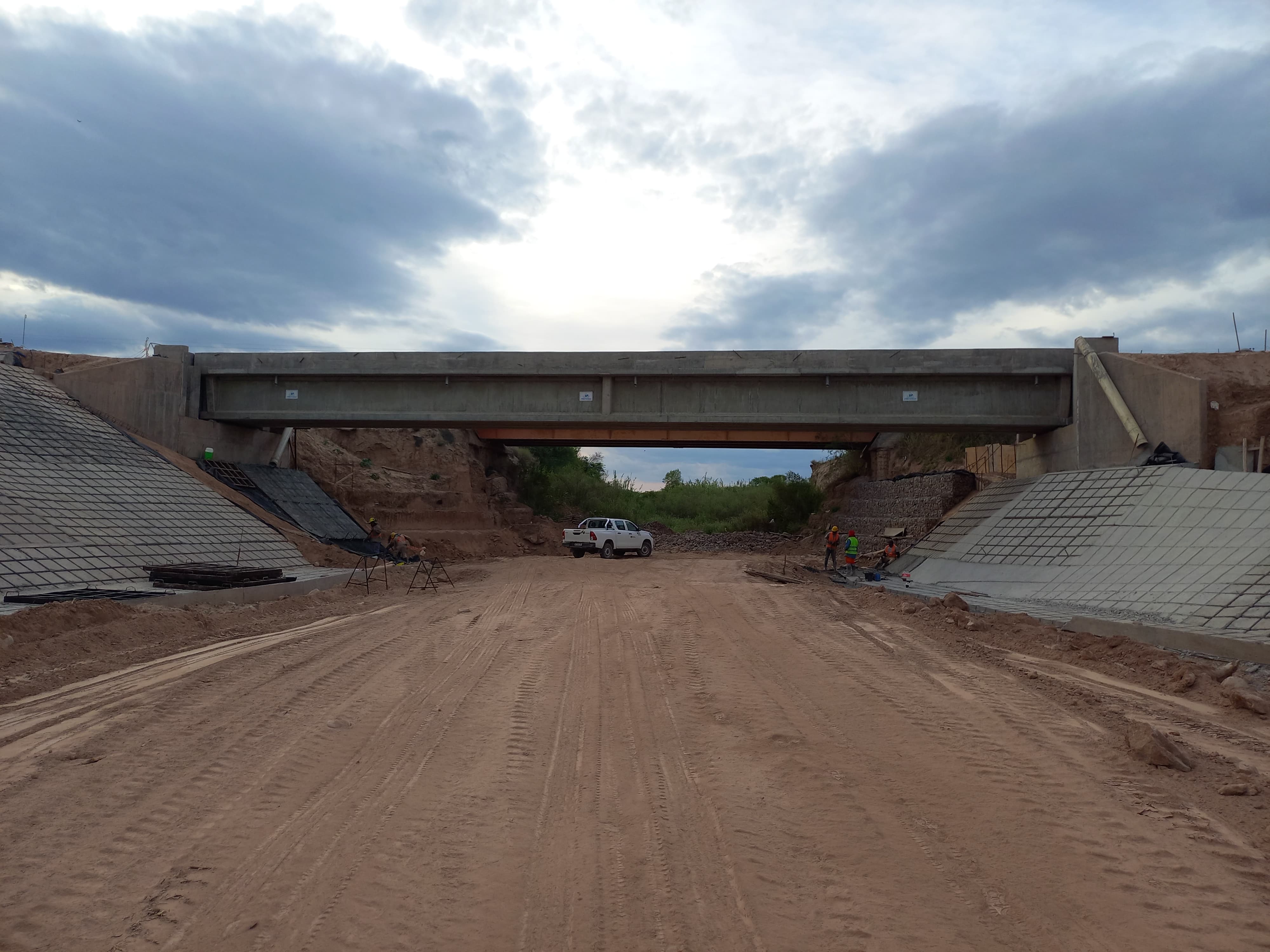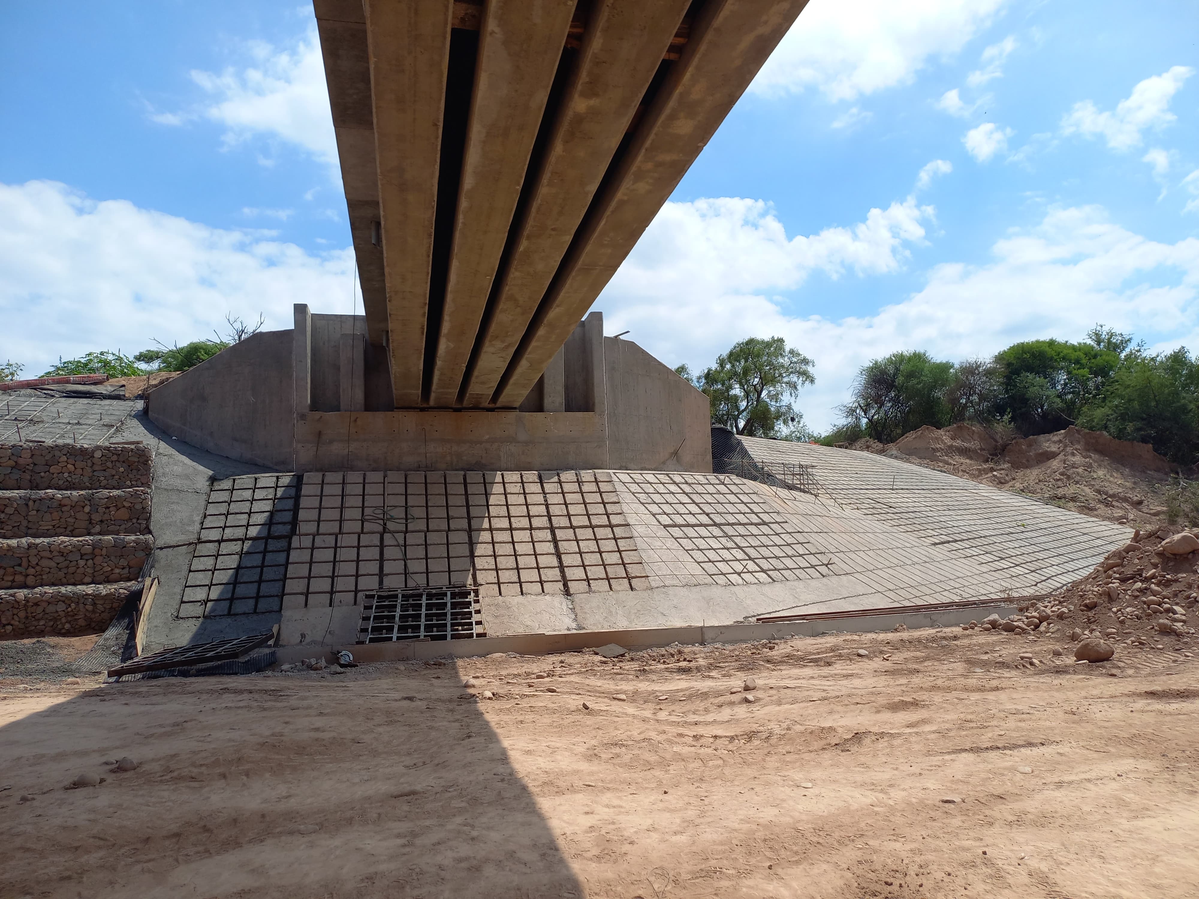 confeccionado por viga tablero U de HºPºPº; pilotes de HºAº, pantalla frontal, muros de ala, cabezales y contrafuertes y espaldones en estribos.